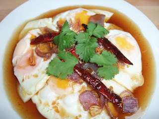 นำไข่ดาวมาวางลงจาน ราดด้วยน้ำไข่ลูกเขยที่ทำใว้แล้ว โรยหัวหอมเจียว พริกทอดกรอบ และใบผักชี เสิร์ฟ
