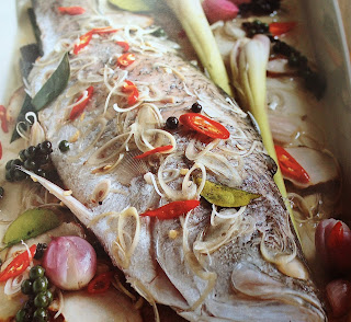 โรยตะไคร้ พริกไทยอ่อน พริกขี้หนู และ หอมแดงบนตัวปลาให้ทั่ว นำนิ่งไฟแรง 15 นาที จนปลาสุกยกลงจัดเสิรฟ
